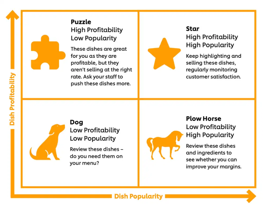 - Puzzles – High profitability but low popularity. The margins are there, but sales are not. These often require better placement on the menu, stronger descriptions, or additional staff support to facilitate upselling.